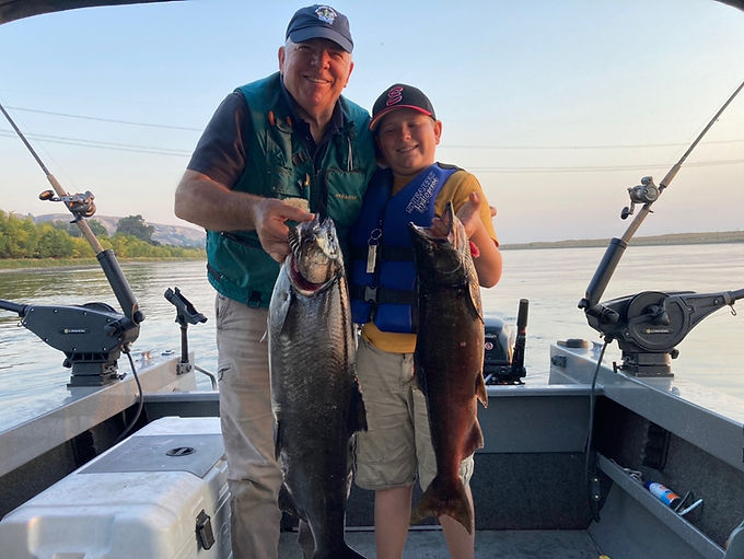 Dale Schielke submitted two photos of he and his grandson, Brandon Evans, with Chinook salmon caught on a tuna wrapped quikfish and an egg wrapped Maglips near Ringold on 9/28/2025. Photos by Brandon’s dad, Dan Evans.